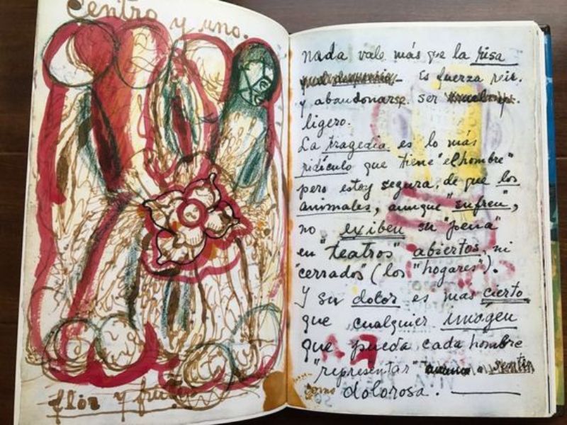 Les pages colorées des carnets de Frida Kahlo révèlent le tumulte de sa vie mêlé à la puissance de son art. À travers des esquisses et des mots chargés d’émotion, elle livre les douleurs et les amours qui ont façonné son monde intérieur. Pour Frida c’est une façon de connecter avec ses propres émotions, de développer ses idées et d’enrichir sa démarche artistique. Ce carnet, à la fois de croquis et journal de thérapie, a tout d’un exutoire.