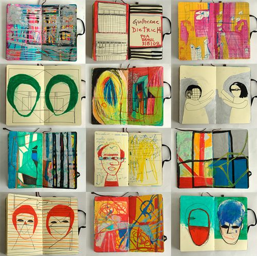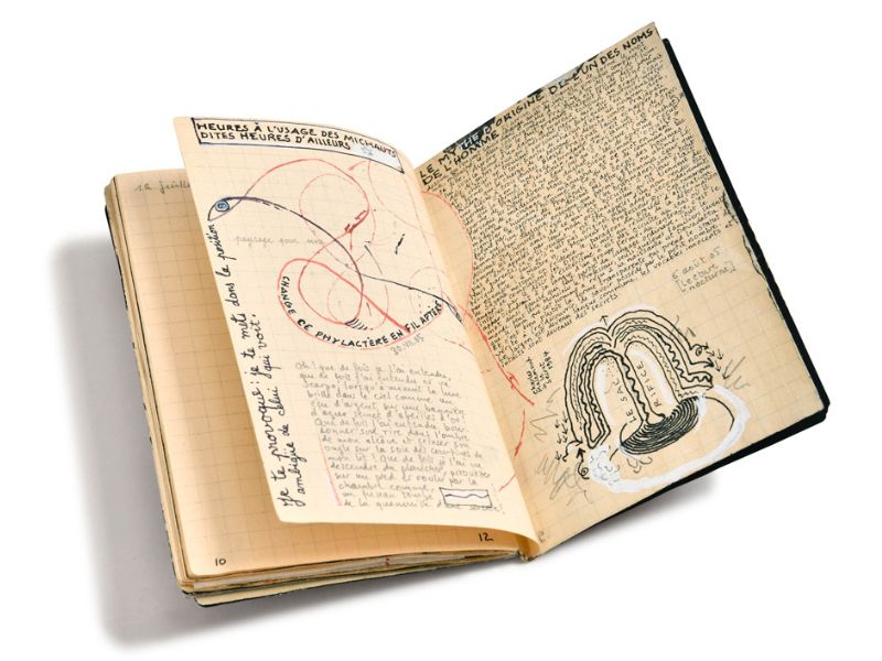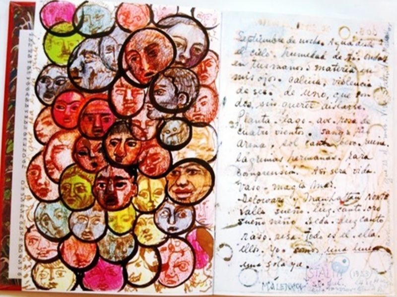 François Righi, artiste des mots et des images, a transformé ses carnets en véritables œuvres poétiques. Les pages se remplissent de métaphores visuelles, de dessins à la mine de plomb et à la gouache, de graphies minuscules, de notes d’ateliers, de collage d’images, de citations et de réflexions philosophiques. Chaque carnet devient un paysage de sensations, créant un dialogue entre l’écriture et l’illustration.