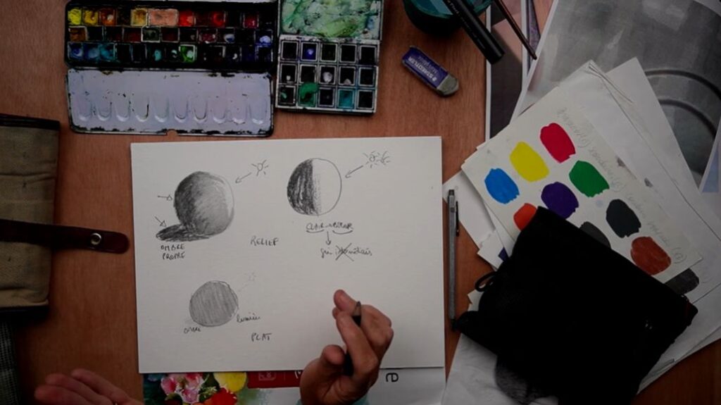 Lorsque vous travaillez sur les ombres en aquarelle, vous réalisez qu’il existe deux types d’ombre : l’ombre propre et l’ombre portée.