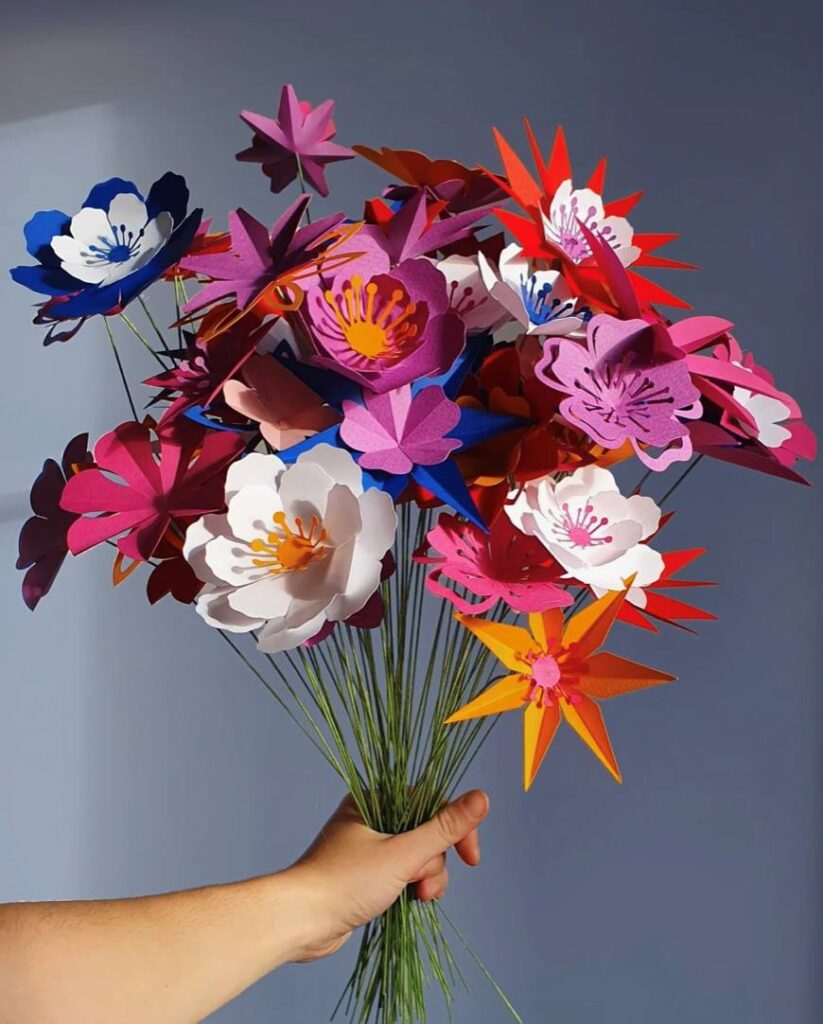 Ensemble, on va découvrir plusieurs techniques de découpage et de pliage pour créer deux fleurs et ses pistils. On va prendre le temps de comprendre ses techniques pour pouvoir les transposer en taille, en style et en couleurs différentes. À la fin, cela nous donnera deux créations florales colorées pour décorer une table ou un mur par exemple !