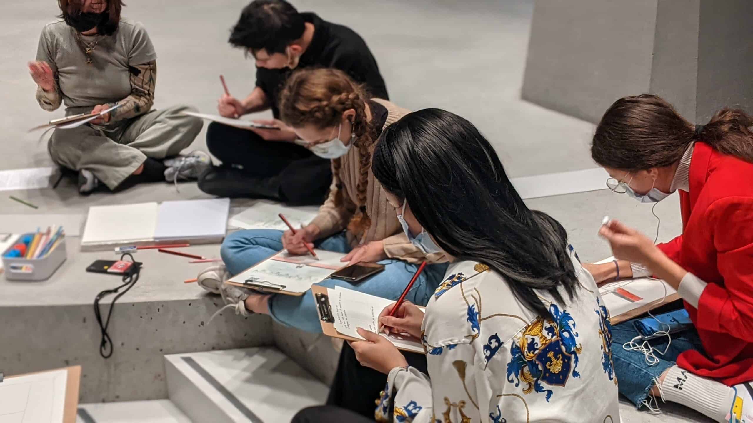 Alors, évidemment, nous étions plus que ravies de pouvoir intervenir pour deux ateliers en nocturne offerts à leur adhérents SuperCercle, âgés de 18 à 26 ans. Le concept ? Brouiller nos sens ! Car pour ces ateliers, les participants ont dû se laisser guider, non pas par leur vue, mais leur OUÏE, en partant d’audiodescriptions d’œuvres présentes dans le musée (mais sans avoir vu ces œuvres !). Nadja M, artiste au PAON, les a invités à se concentrer uniquement sur l’écoute pour dessiner ce qu’ils entendaient, ou plutôt ce qu’ils imaginaient.