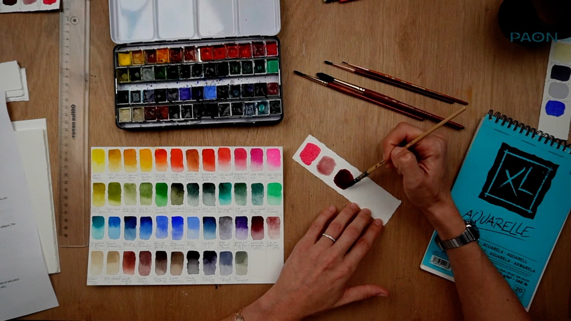 Avant de vous lancer dans une aquarelle, sélectionner les teintes que vous souhaitez utiliser. Dans son atelier « Ouvrir nos horizons à l’aquarelle », Ondine de Peretti recommande d’en sélectionner 5 maximum pour éviter l’effet « tutti frutti ». En fonction du rendu que vous souhaitez avoir et de vos envies du moment, sélectionnez un mélange de teintes foncées et claires, saturées et désaturées, chaudes et froides. Pour les choisir, Ondine commence par en sélectionner une, la principale, l’applique sur une chute de papier, puis la balade au dessus de son nuancier afin de voir quelques teintes iraient bien avec.