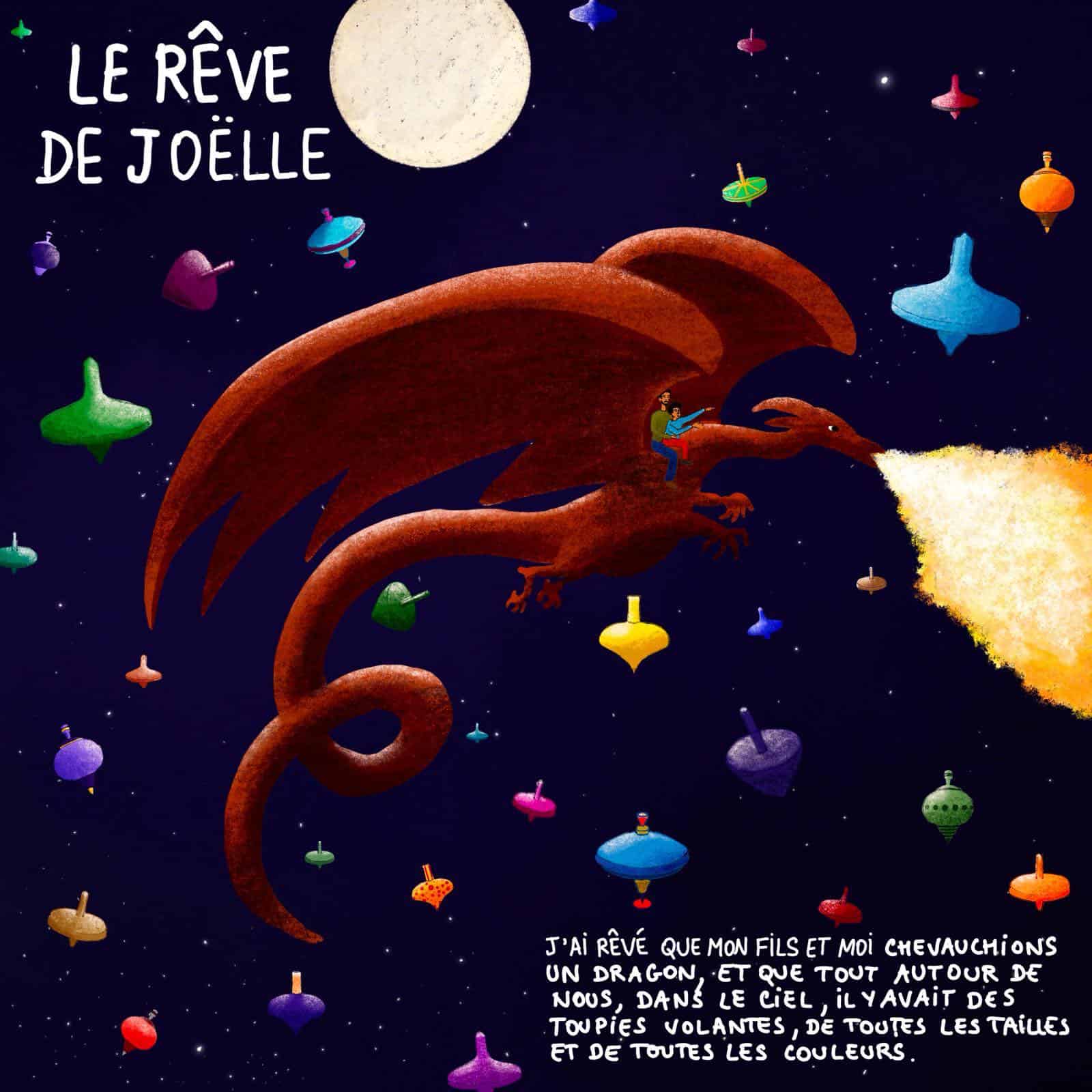 “Cette nuit j’ai rêvé que mon fils et moi chevauchions un dragon… et que tout autour dans le ciel, il y avait des toupies volantes de toutes les tailles et de toutes les couleurs”