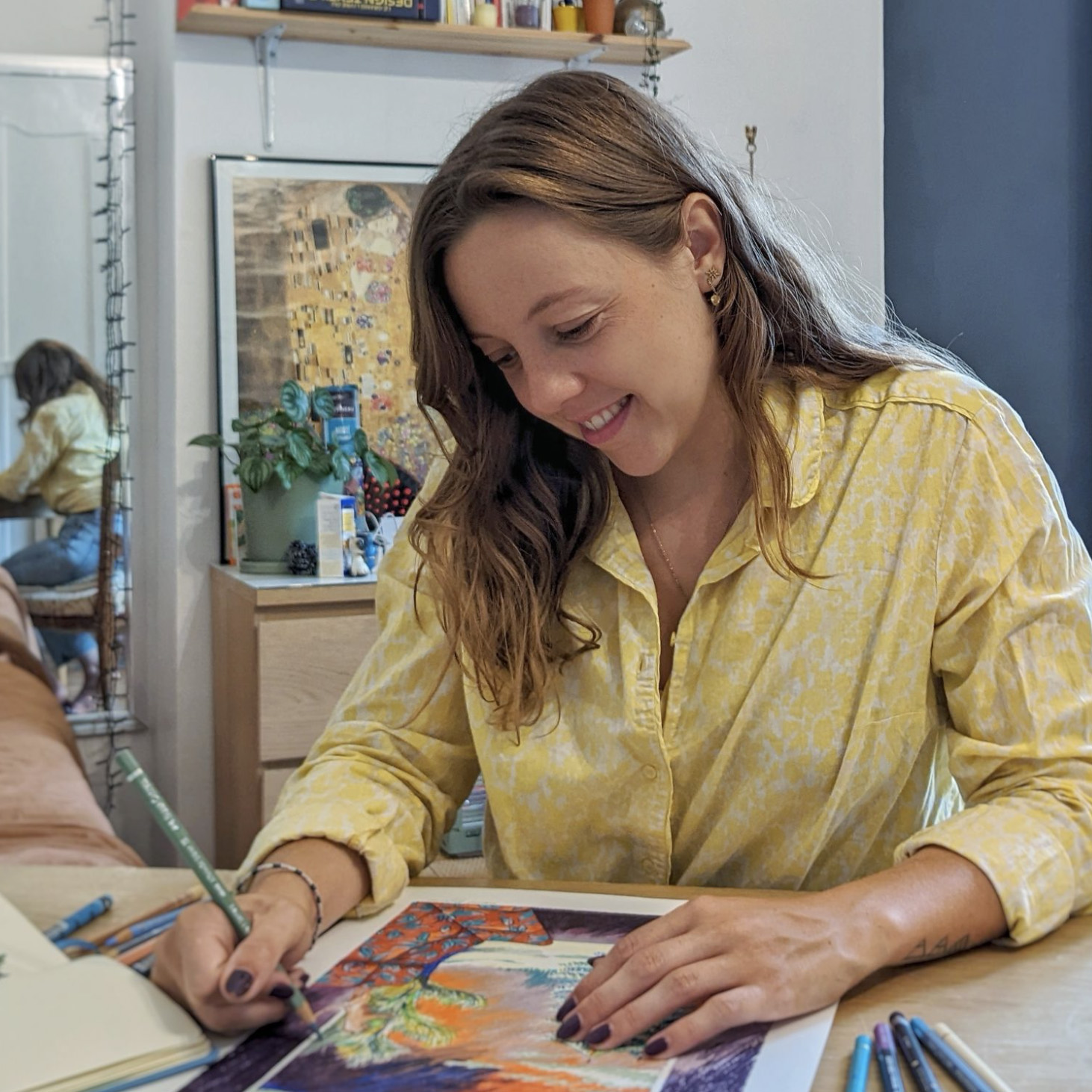 En tant que designer textile, j’utilise tous les médiums traditionnels : l’aquarelle, l’encre, le crayon, le pastel ou le collage. En tant qu’illustratrice je me suis focalisée sur le crayon de couleur très pigmenté, et les pastels gras, généralement très colorés.