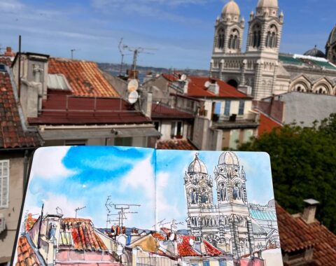 Félicitations, vous avez réalisé votre premier croquis en plein air ! Multipliez les dessins pour former un carnet de voyage qui honorent vos moments vécus. Le secret d’une aquarelle urbaine réussie est de laisser des blancs, et cela s’apprend en pratiquant et en aiguisant votre œil. N’ayez pas peur de déborder de la ligne, autorisez-vous à réinterpréter à votre façon les paysages et les scènes de vie que vous voyez et surtout, prenez du plaisir dans ce processus !